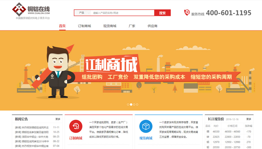 銅鋁在線為有色金屬行業(yè)的電子商務交易平臺,采用系統(tǒng)自動組批團購的方式,將需求相同的客戶組批給統(tǒng)一廠家競價,以組團形式在降低買家采購成本的同時降低工廠的生產(chǎn)成本。平臺同時提供現(xiàn)貨采購模式,供用戶實現(xiàn)快速線上交易。